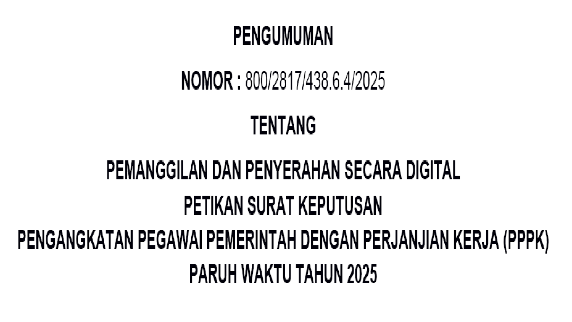 Dengan ini kami sampaikan Pengumuman No. 800/2817/438.6.4/2025 Tentang Pemanggilan dan Penyerahan Secara Digital Petikan Surat Keputusan Pengangkatan...
