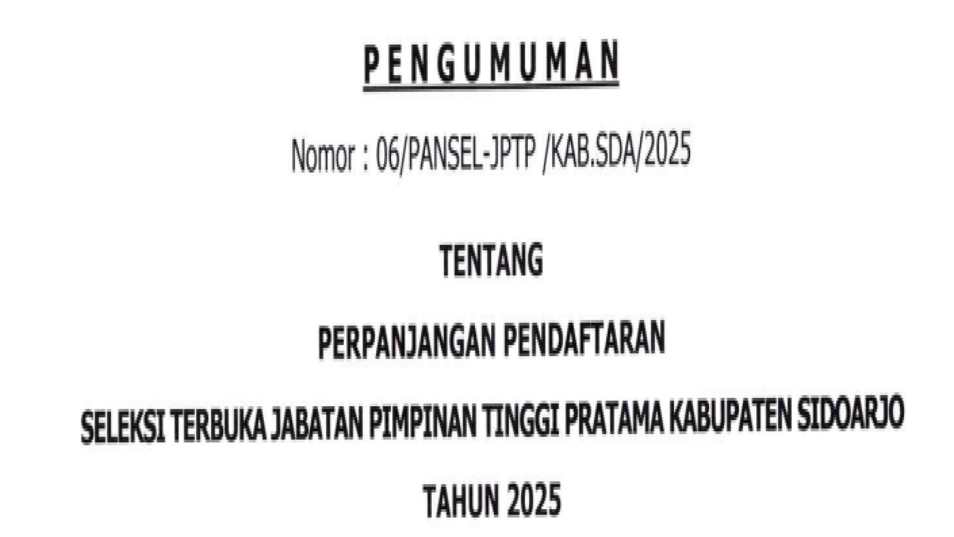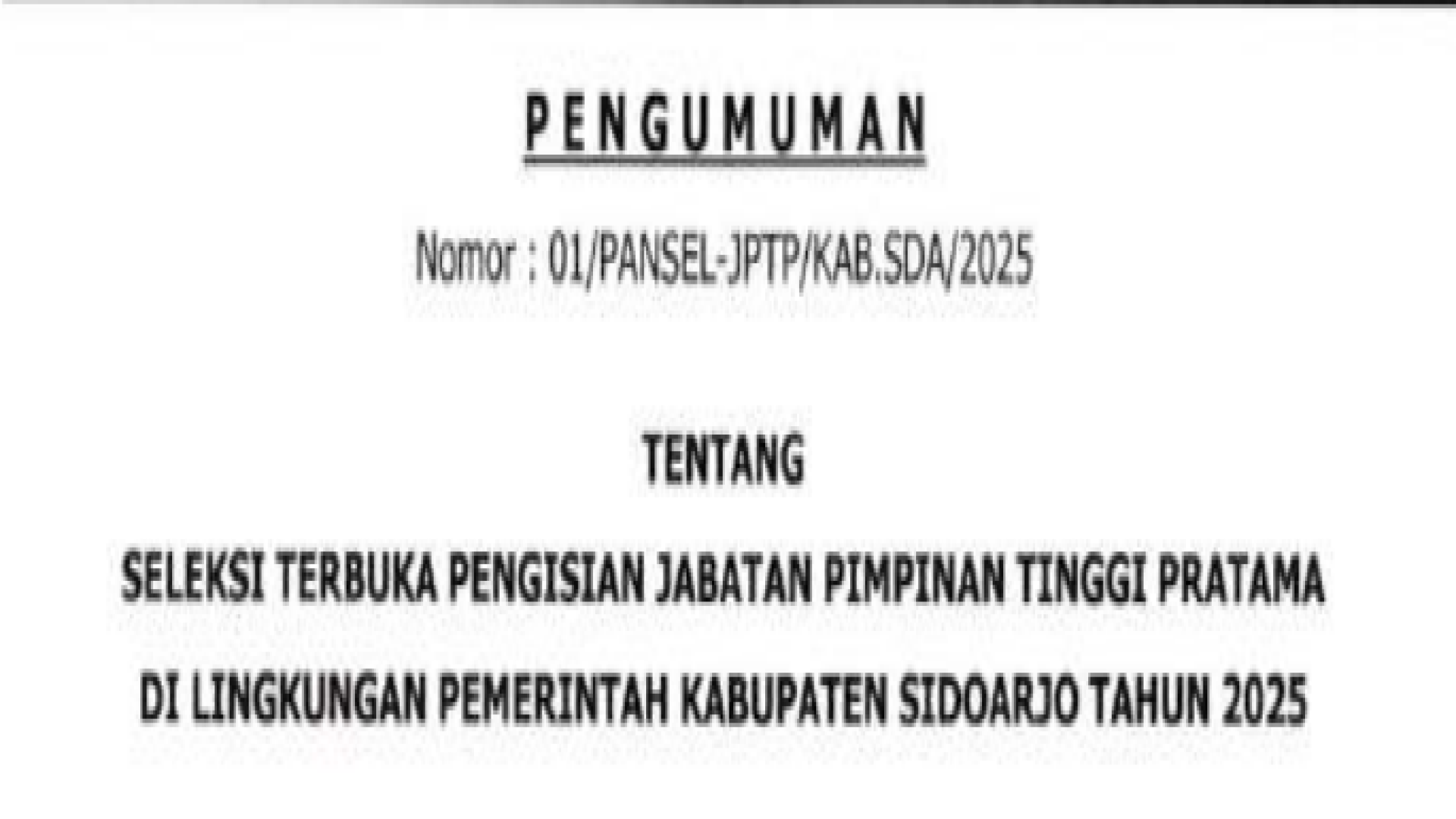 Bersama ini kami sampaikan Pengumuman Nomor: 01/PANSEL-JPTP/KAB.SDA/2025 tentang Seleksi Terbuka Pengisian Jabatan Pimpinan Tinggi Pratama di...