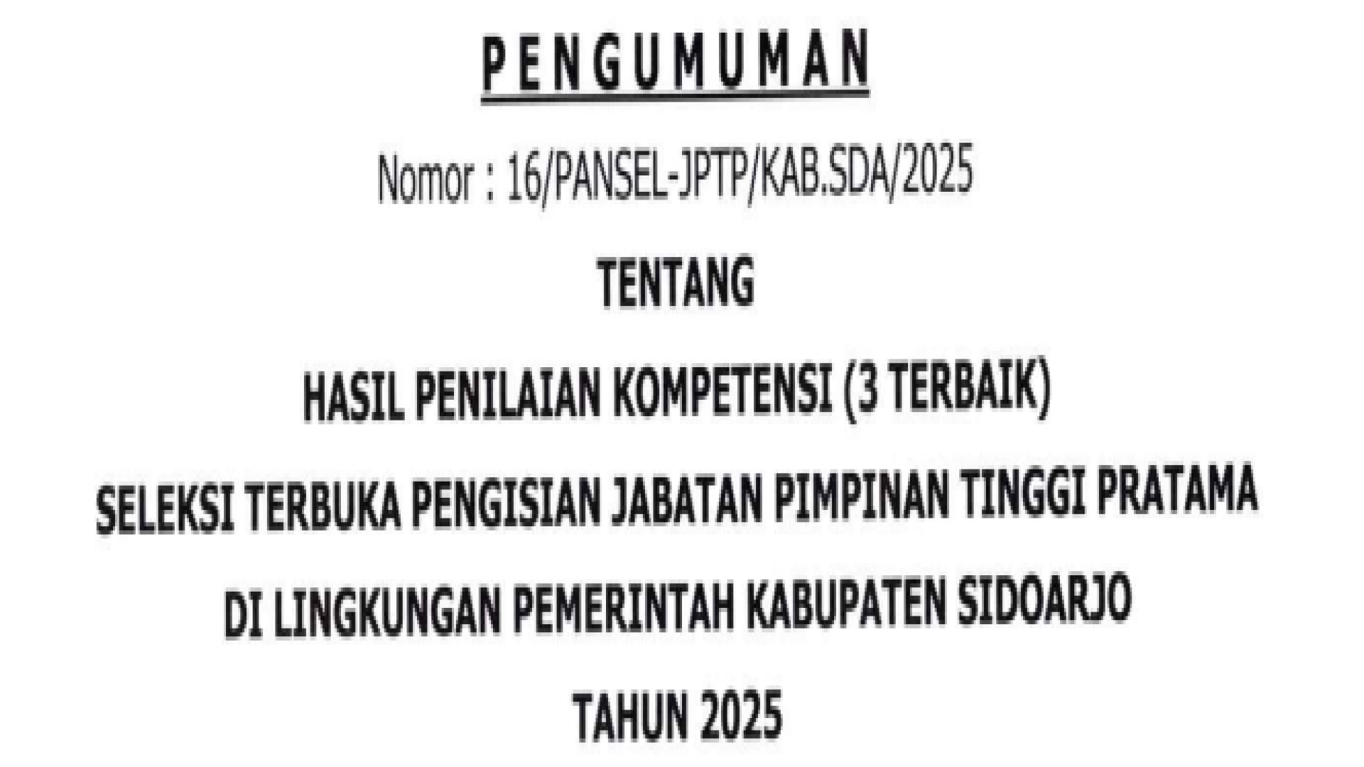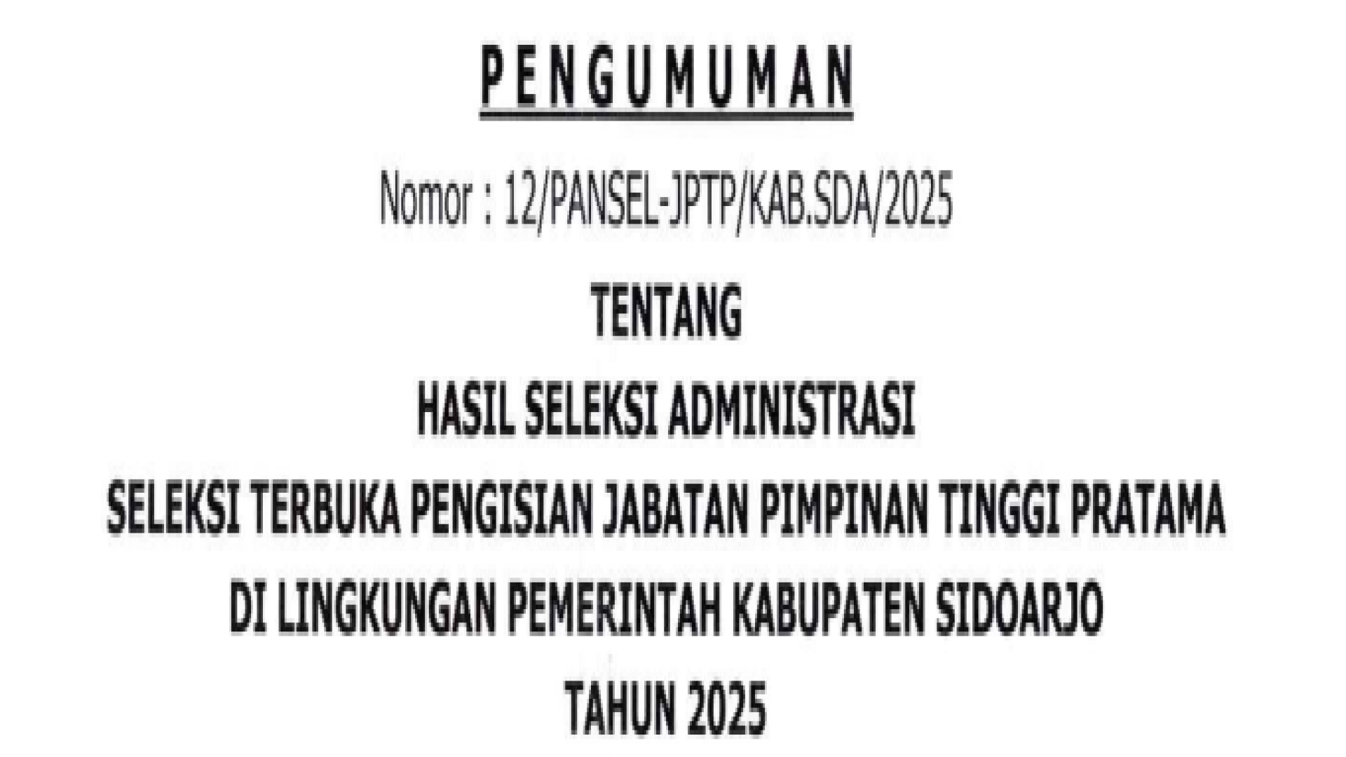 Dengan ini disampaikan Pengumuman No. 05/PANSEL-JPTP/KAB.SDA/2025 tentang Hasil Seleksi Terbuka Pengisian Jabatan Pimpinan Tinggi Pratama di...